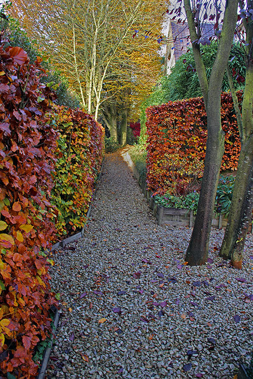 Ce jardin de ville était une friche d'ombre et d'arbustes inintéressants. Tout a été dégagé. Le sol a été terrassé en faux plat montant pour aller chercher la lumière. Deux lignes prolongent des axes visuels de la maison. Le dessin équilibré est apprécié des surplombs. Au niveau du jardin le dessin devient une impression de lignes de couleurs sur les murs peints en ocre. Tout au long de l'année, couleurs et senteurs apparaissent symétriquement à gauche à droite du jardin.